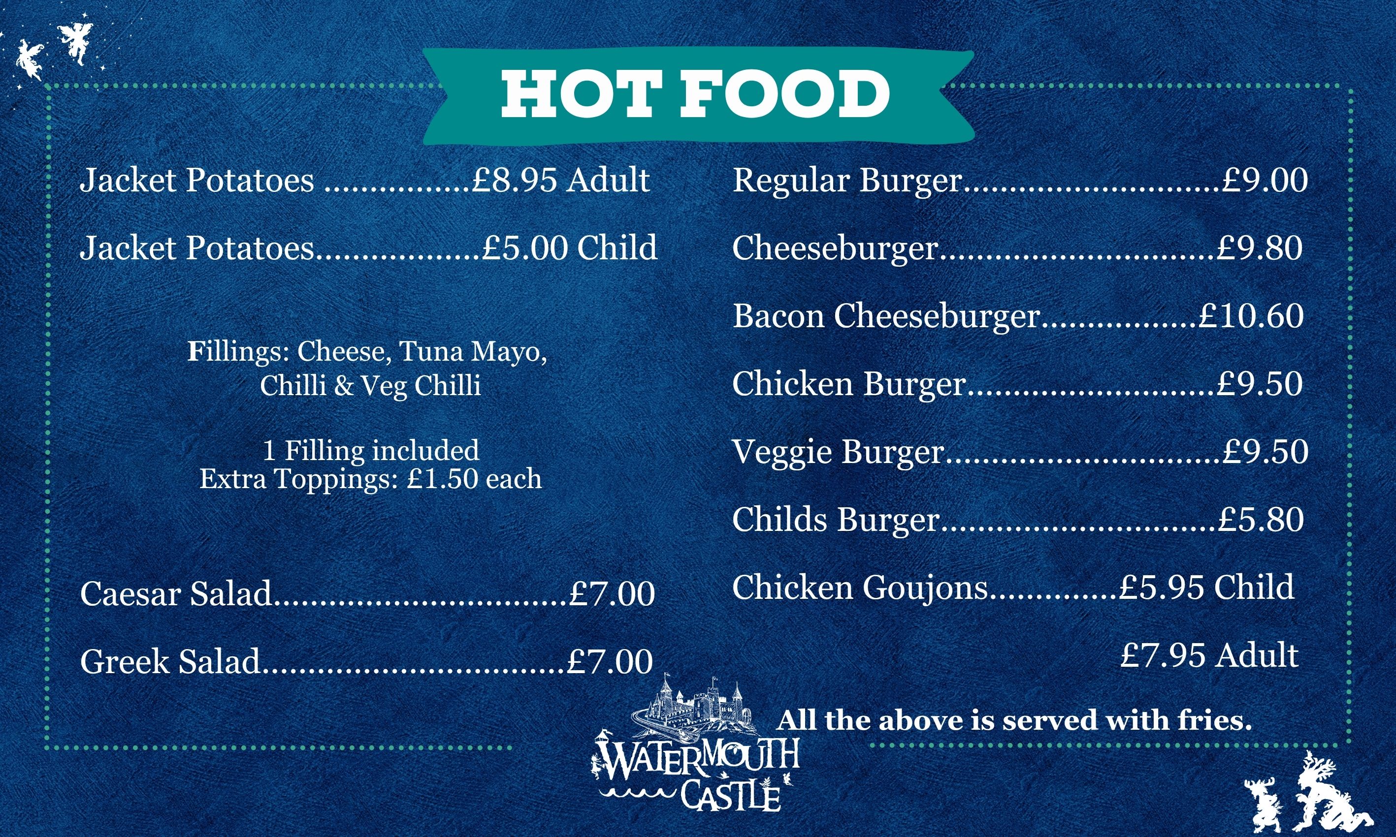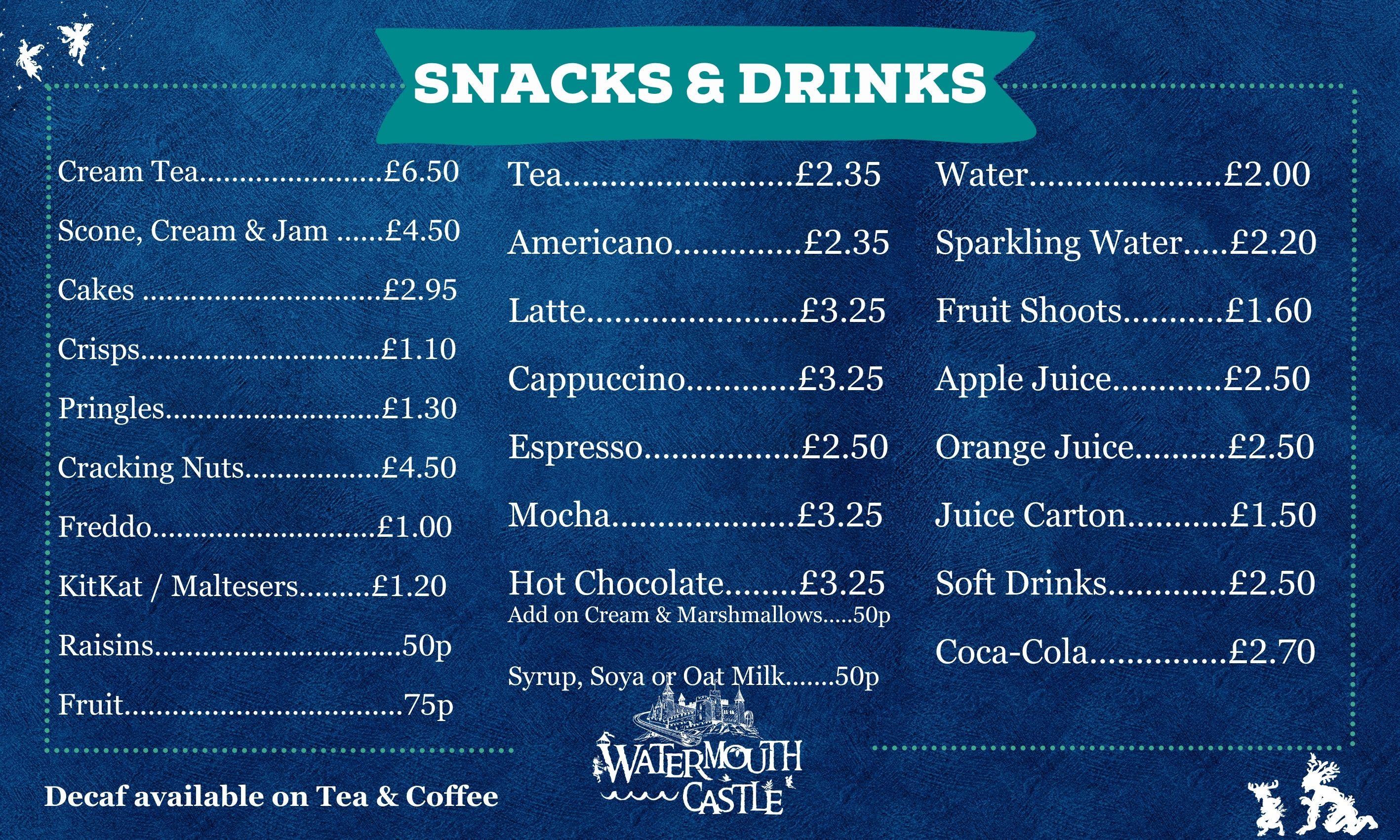 The Garden Café, (outside seating only), situated in the castle gardens, offers a selection of snacks, including baguettes, paninis, salads, pasties, hot dogs, fries, children’s lunch boxes, fruit, cakes, cream teas and ice cream.