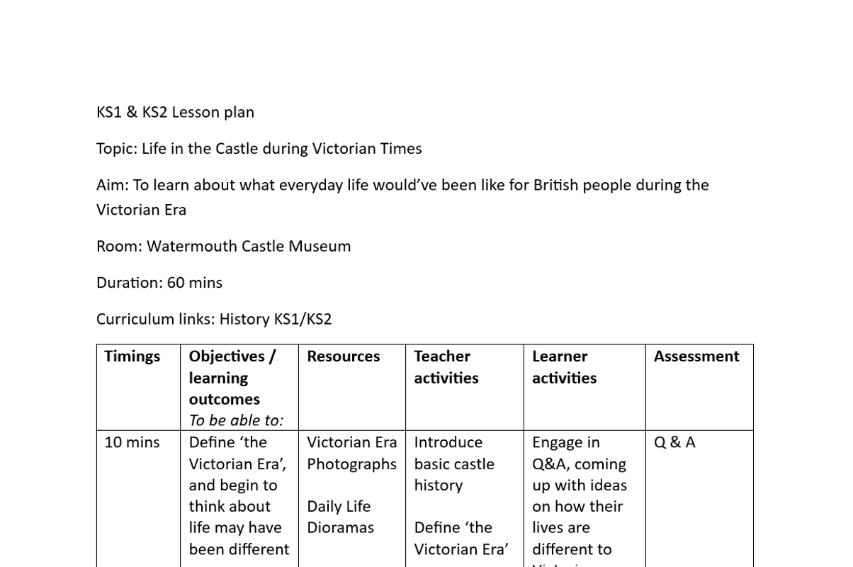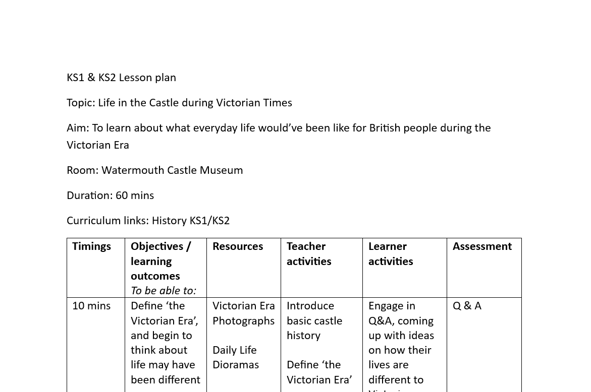 Lesson plan for a history lesson exploring Victorian Life at Watermouth Castle -