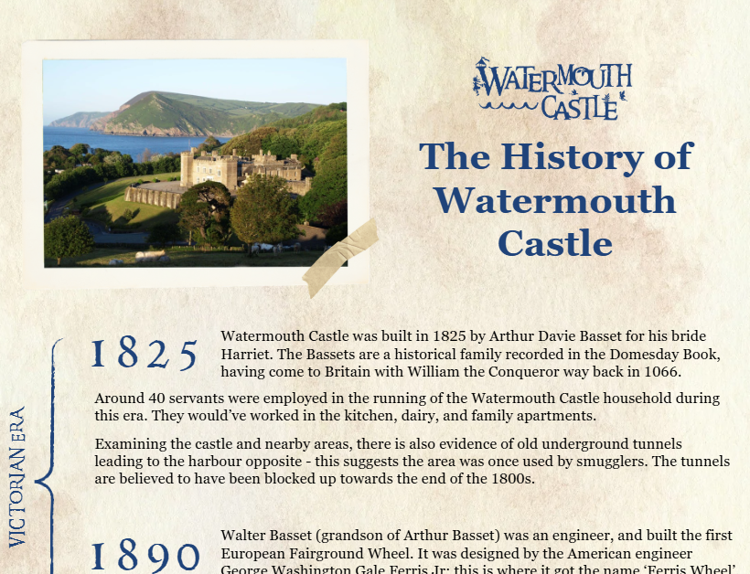 History fact sheet for schools, showing the timeline of Watermouth Castle -
