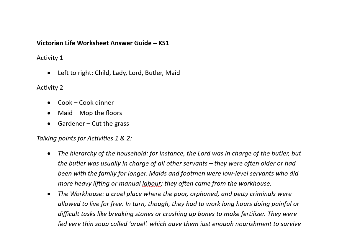 KS1 Victorian Life Worksheet