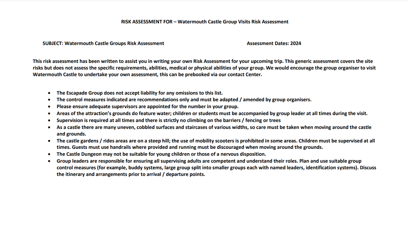 The information provided aims to assist you in creating your own Risk Assessment for your upcoming trip. While this assessment covers site-specific risks, it does not evaluate the individual requirements, abilities, or medical conditions of your group members.